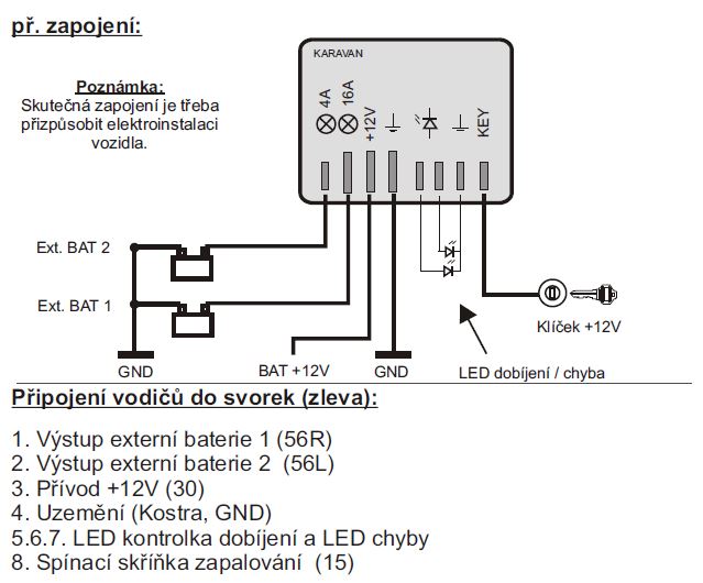 - časová hystereze (5 sec) omezuje nerovnoměrné dobíjení např. při volnoběhu, kdy alternátor dodává méně proudu a napětí baterie kolísá